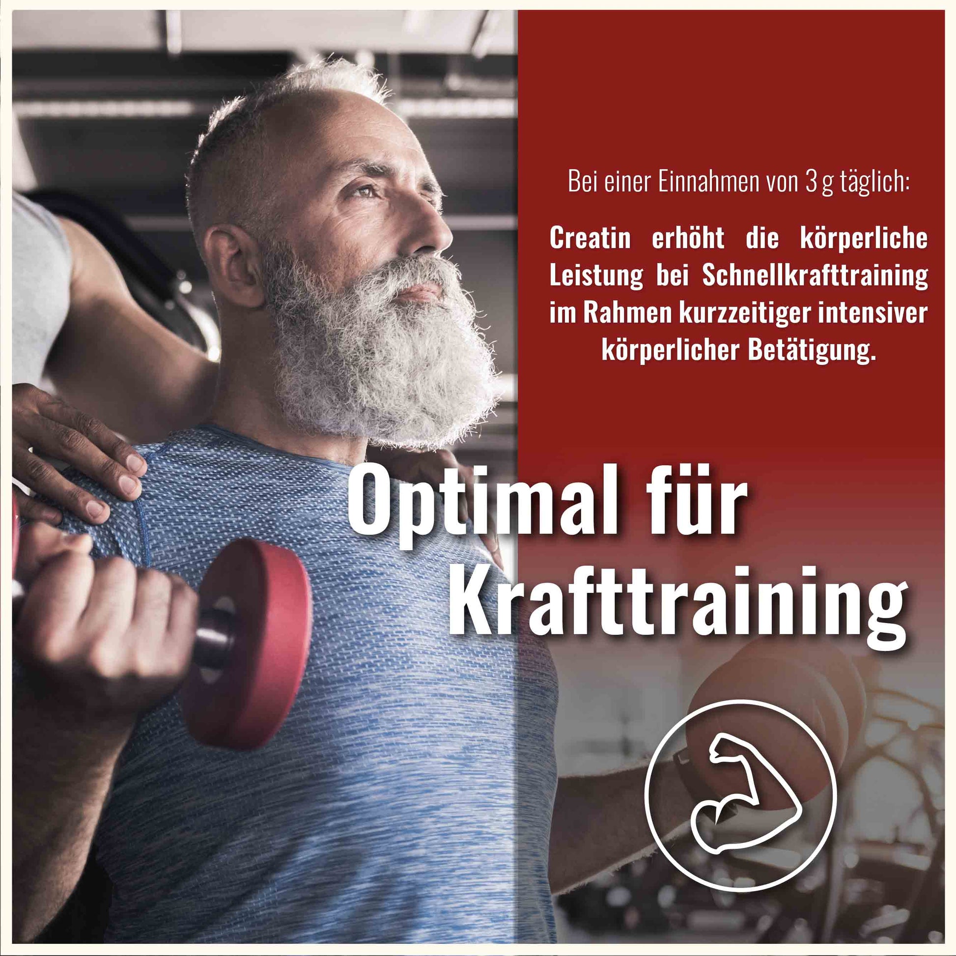 500g für mehr Leistung im Training: Creatin erhöht die körperliche Leistung bei Schnellkrafttraining im Rahmen kurzzeitiger intensiver körperlicher Betätigung. Eine positive Wirkung stellt sich bei einer täglichen Aufnahme von 3g Creatin ein.