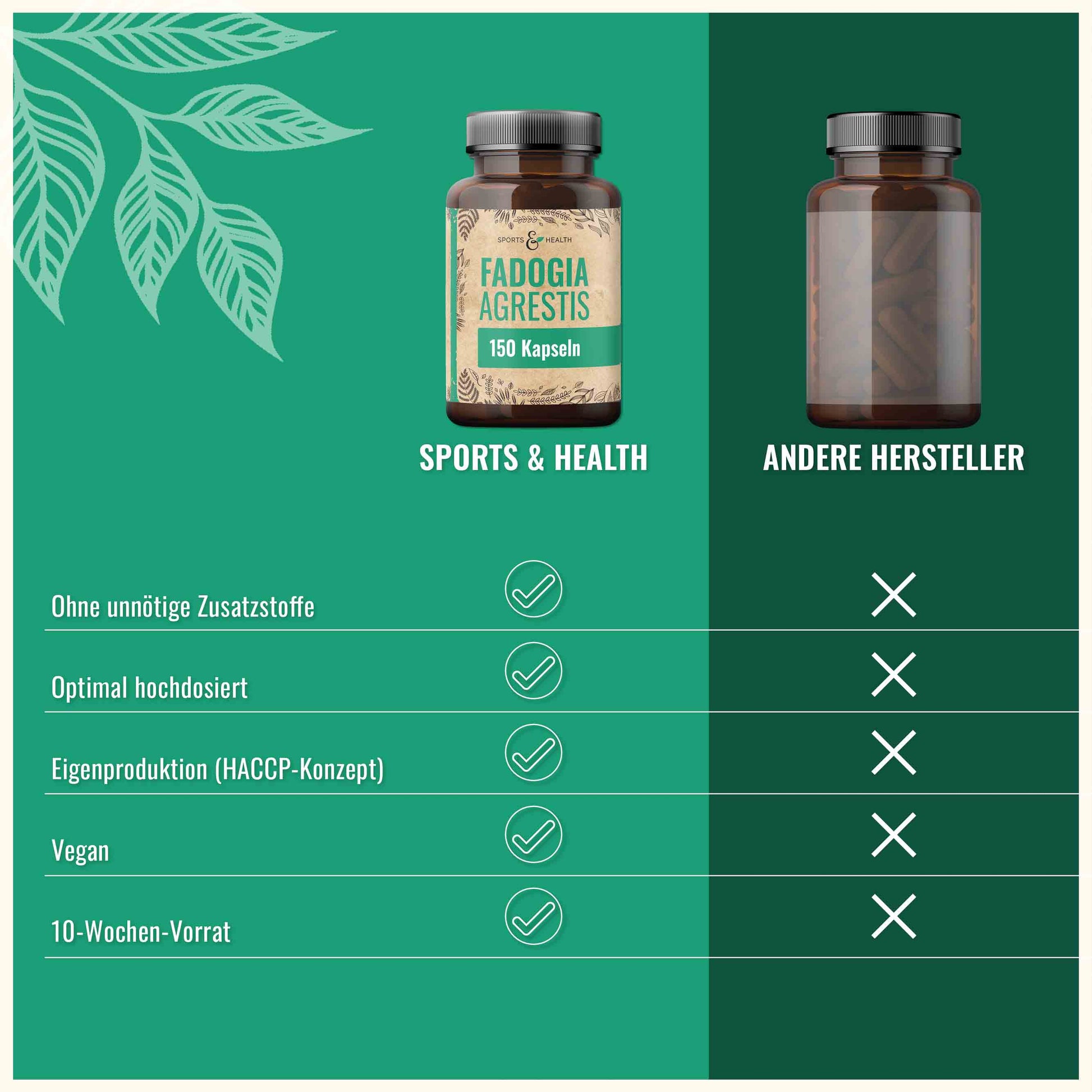 ÜBER 10 WOCHEN VORRAT: Eine Dose der Fadogia Kapseln von Sports & Health enthält 150 Kapseln – bei unserer Verzehrempfehlung von 2 Kapseln täglich hast Du einen Bestand der über 10 Wochen anhält.
