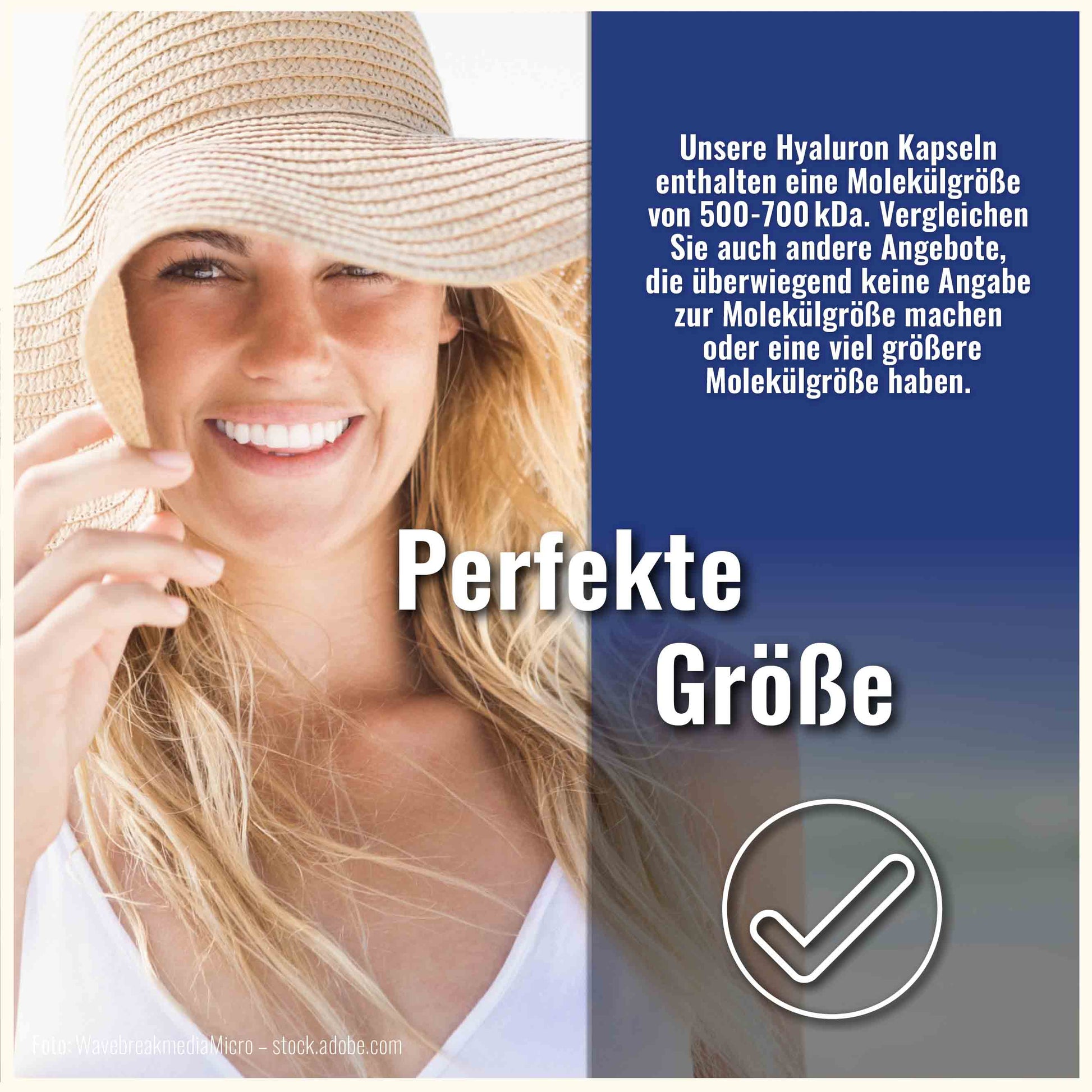 Perfekte Größe: Unsere Hyaluron Kapseln enthalten eine Molekülgröße von 500-700 kDa. Vergleichen Sie auch andere Angebote, die überwiegend keine Angabe zur Molekülgröße machen oder eine viel größere Molekülgröße haben.