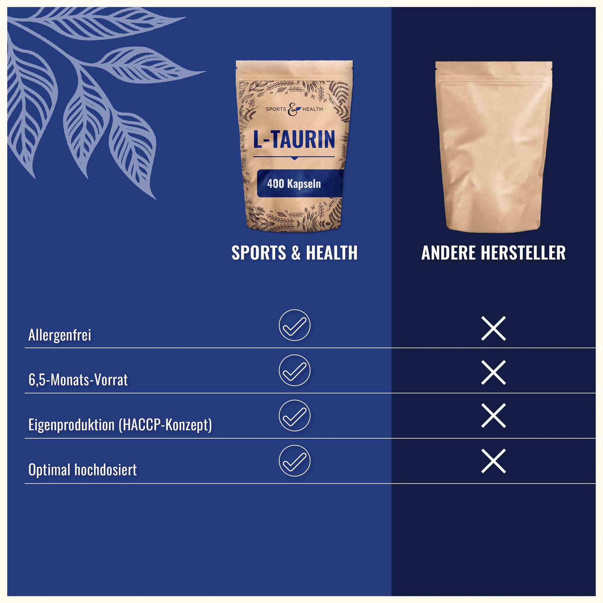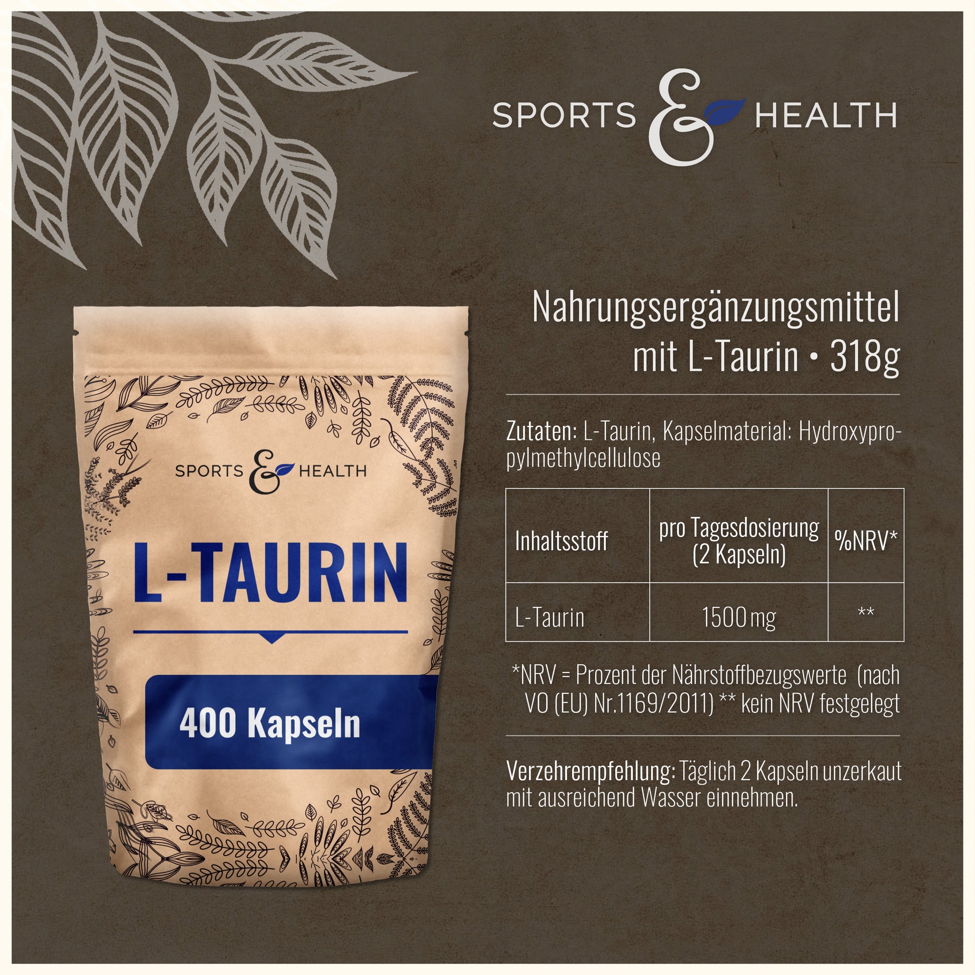 400 KAPSELN: Bei uns erhältst Du 400 hochdosierte L-Taurin Kapseln in nur einem Beutel – die XXL Pre Workout Packung Taurin von Sports&Health.