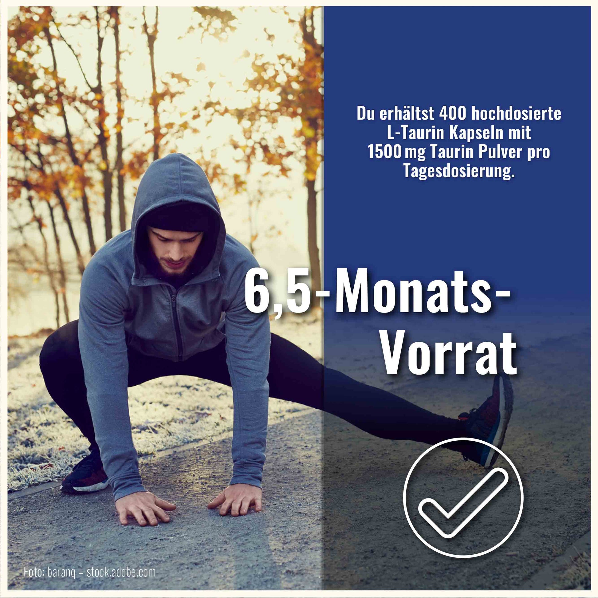 6,5-MONATS-VORRAT: Du erhältst 400 hochdosierte L Taurin Kapseln mit 1500mg Taurin Pulver pro Tagesdosierung. Bei einer Tagesdosierung von 2 Kapseln hast du einen über 6 Monats Vorrat.