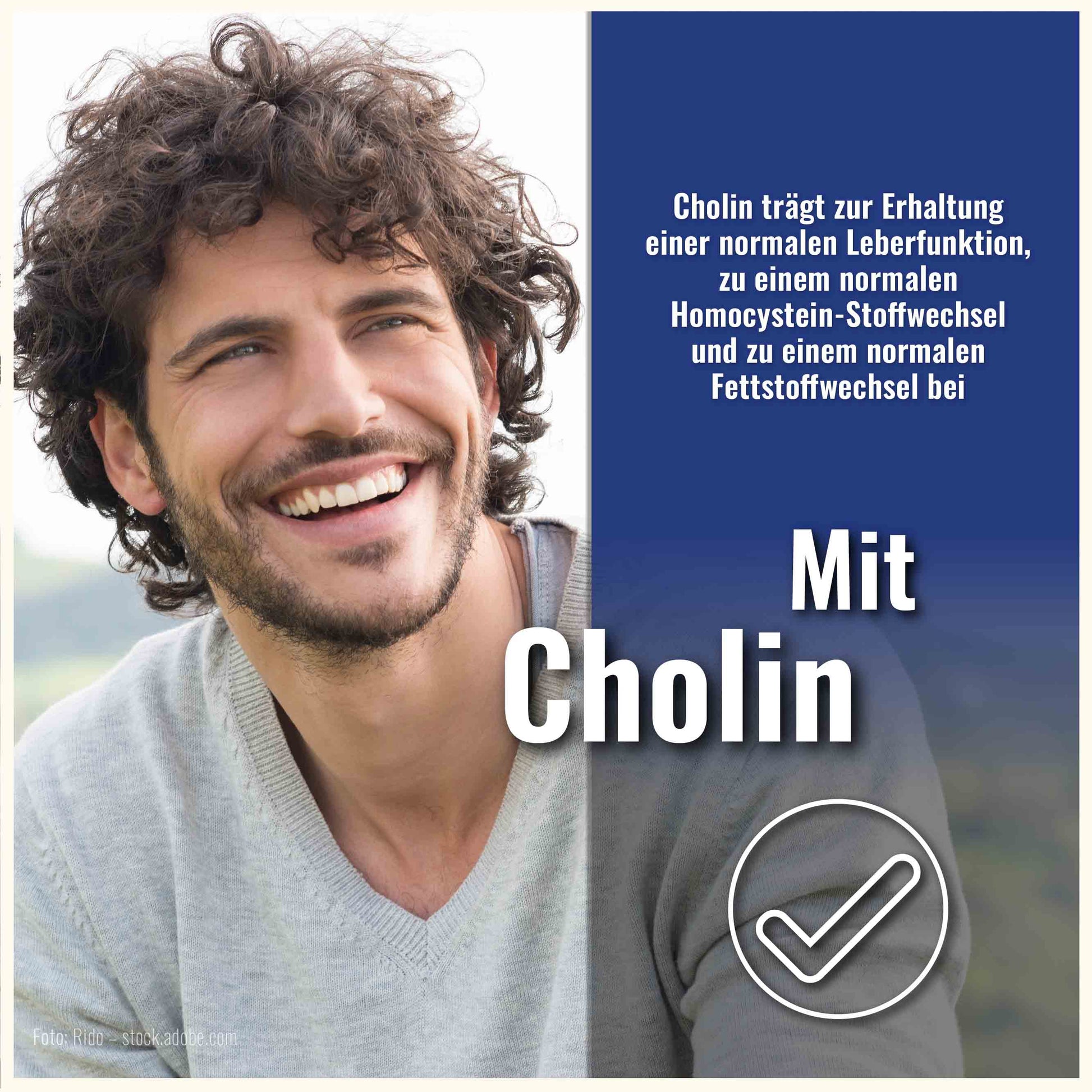 Mit Cholin: Cholin trägt zur Erhaltung einer normalen Leberfunktion, zu einem normalen Homocystein-Stoffwechsel und zu einem normalen Fettstoffwechsel bei.