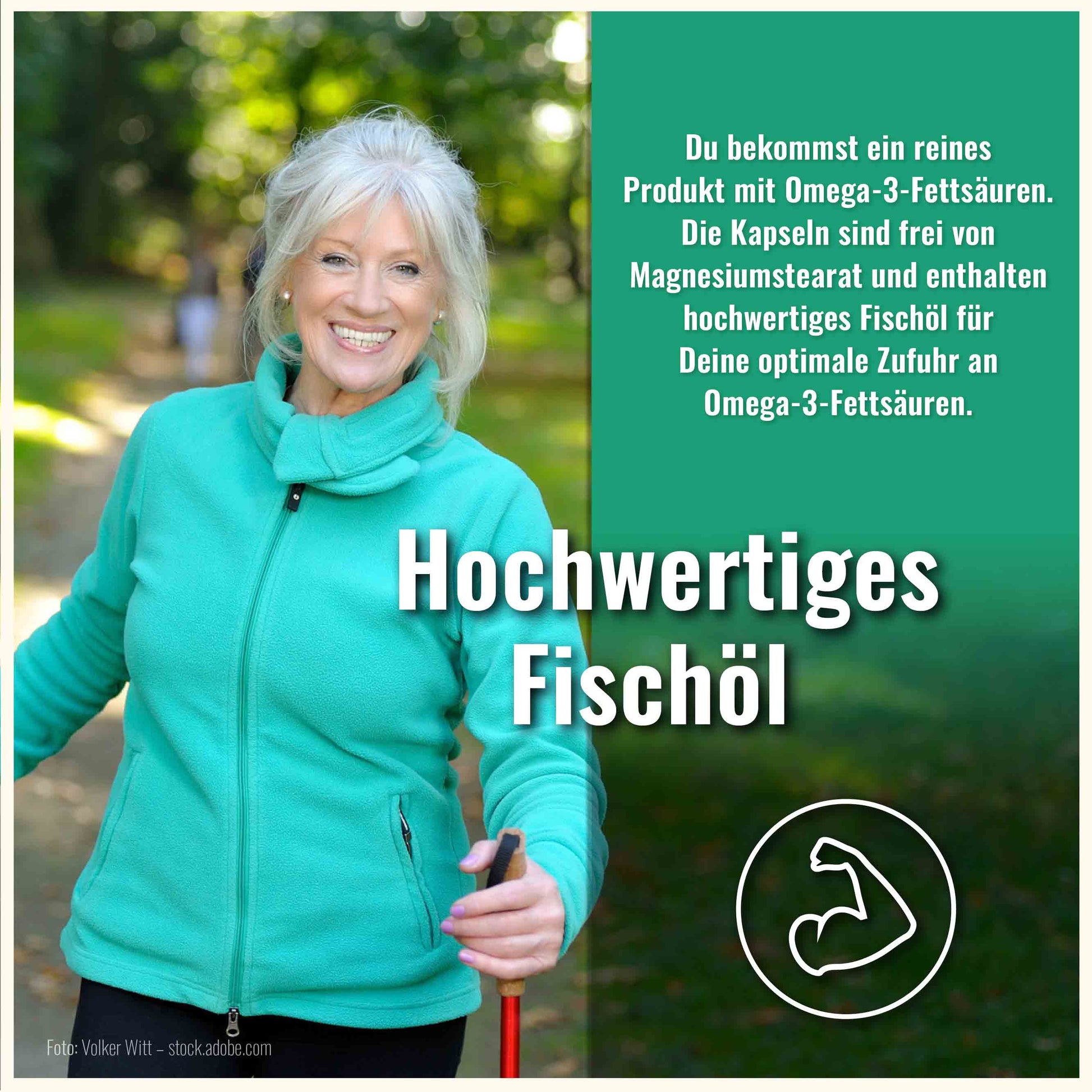 Hochwertiges Fischöl: Du bekommst ein reines Produkt mit Omega-3 Fettsäuren ohne unnötigen Zusatz- oder Füllstoffen. Die Kapseln sind frei von Magnesiumstearat und enthalten hochwertiges Fischöl für Deine optimale Zufuhr an Omega 3 Fettsäuren.